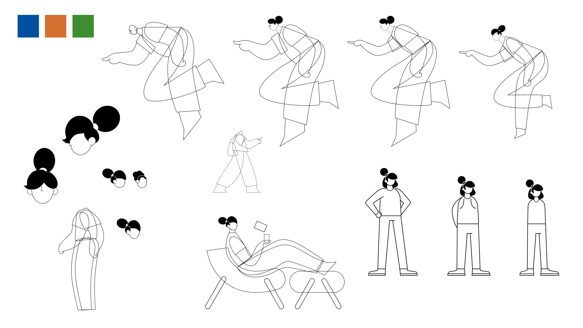 It was clear that the illustrations needed a character and so I had some exploring to do. The illustration were not going to be animated, so there was nog point rigging the characters. Still, I had to illustrate the character from different perspectives and in different poses.